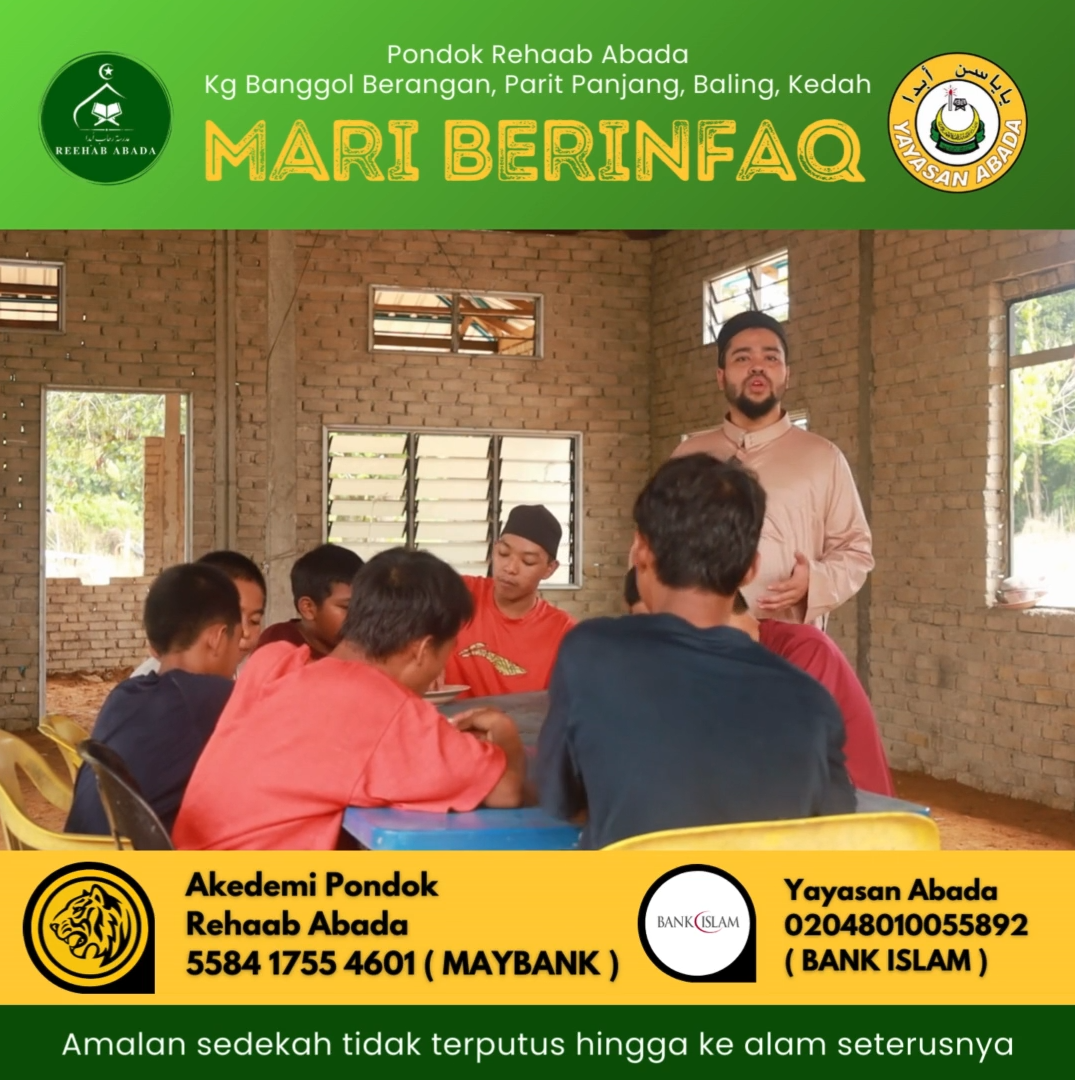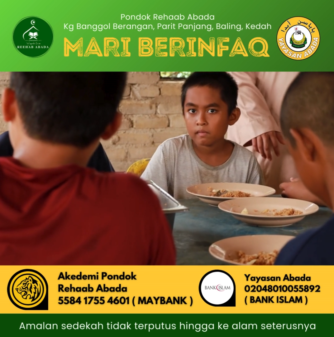 Di Pondok Rehaab Abada, kami berusaha untuk mencetak generasi yang memiliki kecintaan terhadap ilmu dan Al-Quran. Namun, usaha ini memerlukan sokongan daripada anda.
