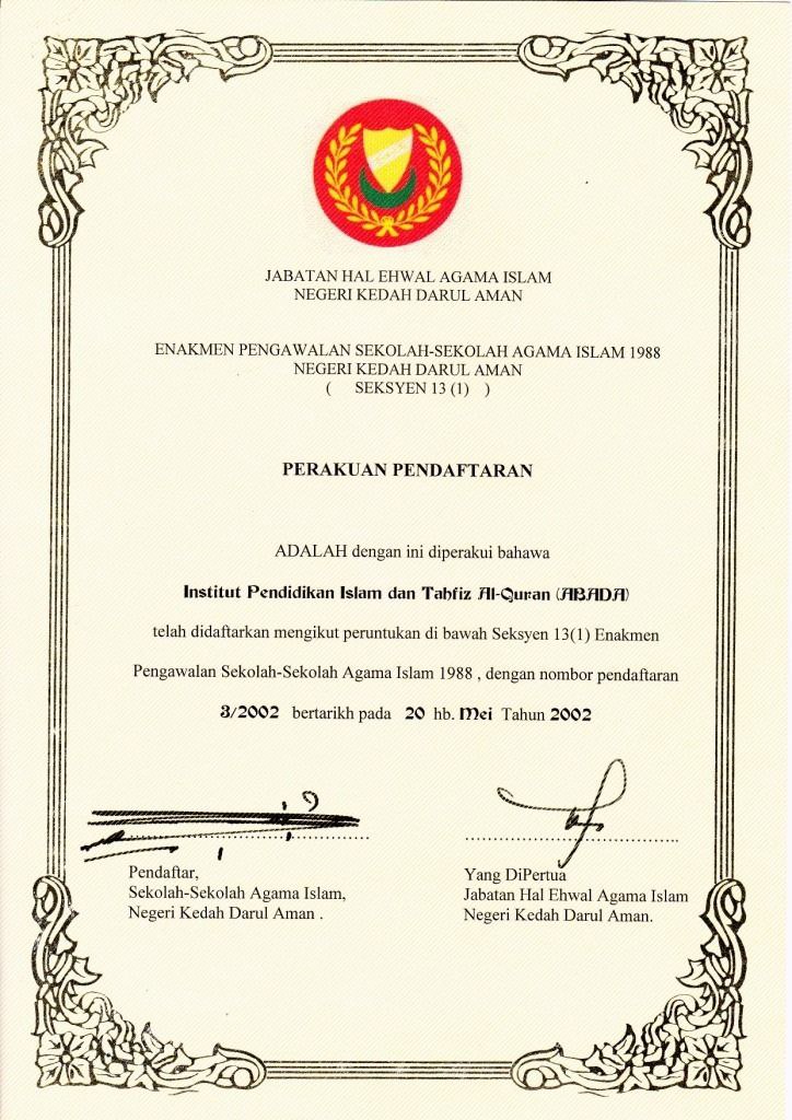 Sijil ini diberikan sebagai penghargaan atas sumbangan ikhlas anda dalam Infaq Wakaf Pondok Rehaab Abada. Semoga Allah memberkati usaha ini dan melimpahkan pahala yang berkekalan.